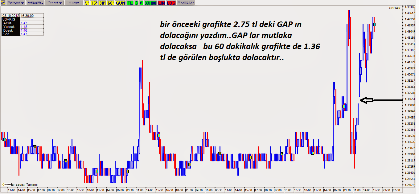 Saatlik  grafikte  1.36 tl deki gap dolarsa ki doldu bütün gaplar dolacaktır 2.57 deki gap ta birgün gelecek dolacak..